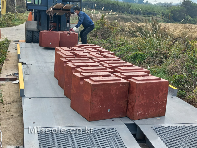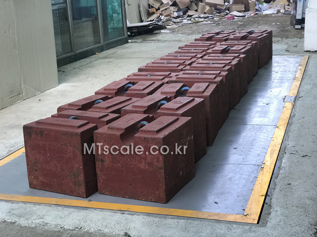 5톤 트럭스케일이므로 분동 5톤(5개)을 올려서 정밀도를 확인합니다.