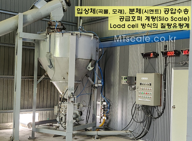 4, 수송 System의 종말지점에 로드셀 방식의 “질량유량계”를 설치하여 수송 상태를 실시간으로 표시하고 수송 System을 Control 합니다. 특히 질량유량을 감지하여 “Bag filter의 배압상태”를 판단 할 수 있습니다.
